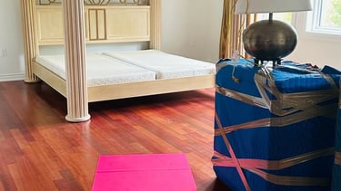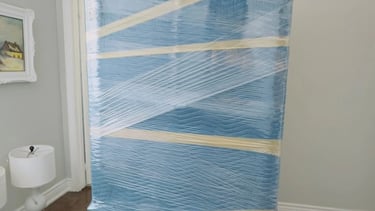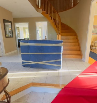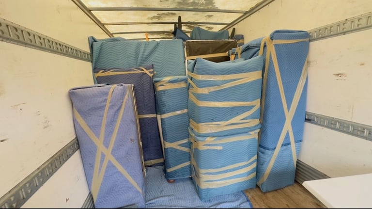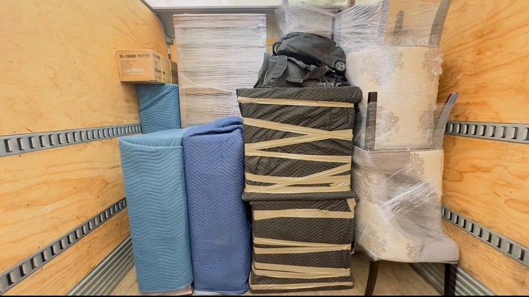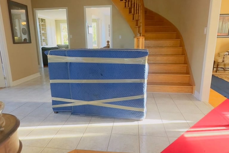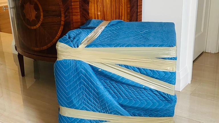 Sofas, beds, tables, and TVs wrapped in blankets, shrink wrap, and proper protection.